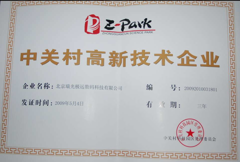北京瑞光極遠數(shù)碼科技有限公司被評為中關(guān)村高新技術(shù)企業(yè)。