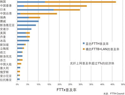 2009年6月全球光纖上網(wǎng)普及率超過1%的經(jīng)濟(jì)體(國(guó)家和地區(qū))已增加到21個(gè)。在全球光纖上網(wǎng)普及率排名方面,亞太地區(qū)仍然引領(lǐng)全球占據(jù)前4名。2009年上半年韓國(guó)普及率超過46%,位居第1名。中國(guó)香港、日本分別以約33%、約30%緊追其后,中國(guó)臺(tái)灣則以約19%穩(wěn)居第4名,其次是北歐國(guó)家瑞典和挪威等地,中國(guó)大陸排名十六(參見圖1)。而且其中挪威、斯洛維尼亞、安道爾、冰島、荷蘭、斯洛伐克、意大利和拉脫維亞等國(guó)基本上發(fā)展的全部是FTTH。