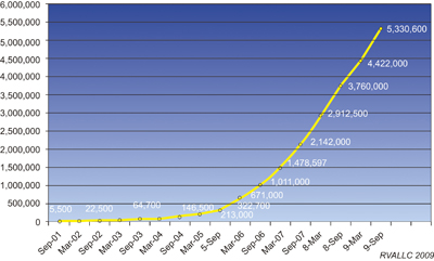 RVA市場(chǎng)研究機(jī)構(gòu)在FTTH委員會(huì)的Houston會(huì)議上指出,北美的FTTH依然在健康發(fā)展,至2009年9月已經(jīng)有1720萬(wàn)個(gè)家庭有光纖經(jīng)過,占北美家庭數(shù)的15%。而簽約使用光纖接入的用戶超過530萬(wàn),一年來增加了150萬(wàn)用戶。2001年至2009年北美FTTH用戶發(fā)展的情況可參看圖3。