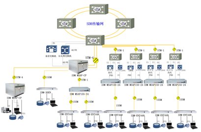 IDM MSAP-G2CP和其他型號的MSAP設備組成星型網絡。MSAP-G2CP作為中心端,匯聚遠端單位的業務。可以實現語音、數據、視頻、E1、數據等多種業務的匯聚傳輸。星型網絡適合于遠端節點較多且較分散的網絡,具有匯聚功能強、網絡穩定的優點。